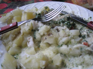 Men kokt färsk potatis och ugnsstekt fisk... i slängt hackad tomat, spenat, grönkål, creme fraiche,smulad fiskbuljongtärning på detta fisk med lite salt och mald svart peppar på...