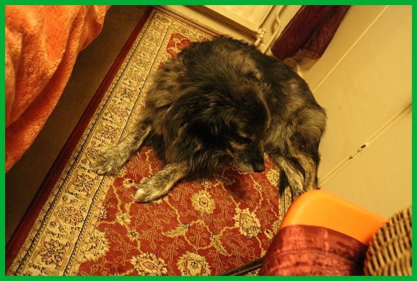 Nellie sov mot tröskeln och jag som inte kunde sova steg ur sängen. Jag satte mig vid PC:n en bra stund... till sist hoppade jag in i sängen och somnade på studs...