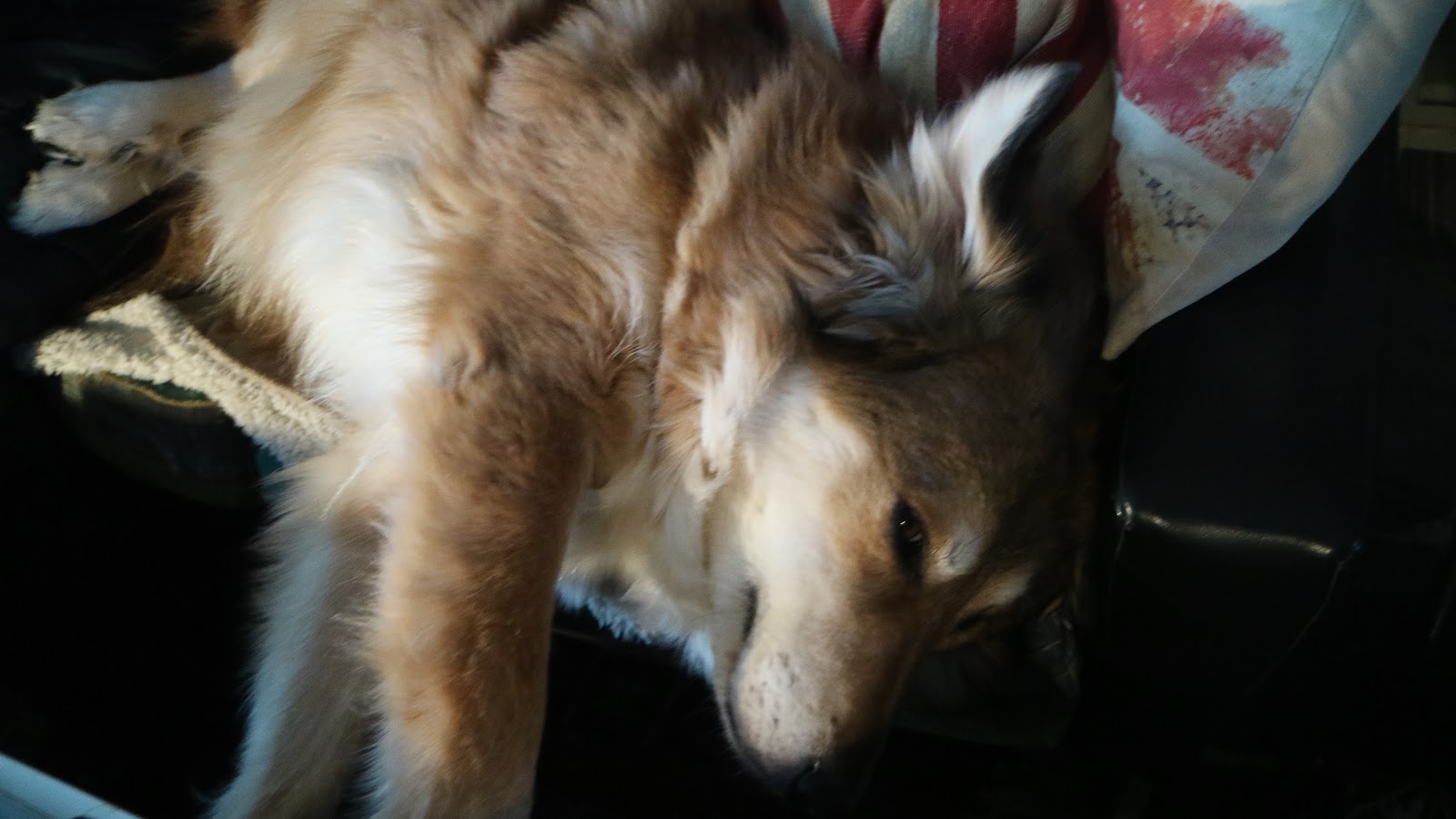 Trötta hundar ... Nu har de dragit sig mot hobbyrummet och inväntar även mig... Hela flocken i hobbyrummet.
